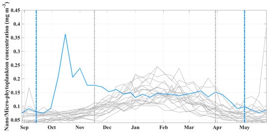 Time series of Chl-a concentration attributed to the combined nano/micro-phytoplankton assemblage (Cn,m), alongside the timings of bloom initiation and termination (blue vertical dashed lines), for the blooming event detected during the autumn/winter of 2002/2003. The Cn,m time series for the remaining years are shown in grey, alongside the climatological phenology metrics computed for the whole period (grey vertical dashed lines).