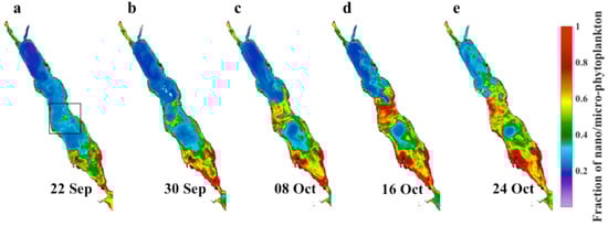 8-day composites displaying the spatial distribution of the satellite-derived fractional contribution of nano/micro-phytoplankton (Fn,m) to total Chl-a concentration. Panels (a–e) represent the development of Fn,m between 22 September and 31 October 2002.