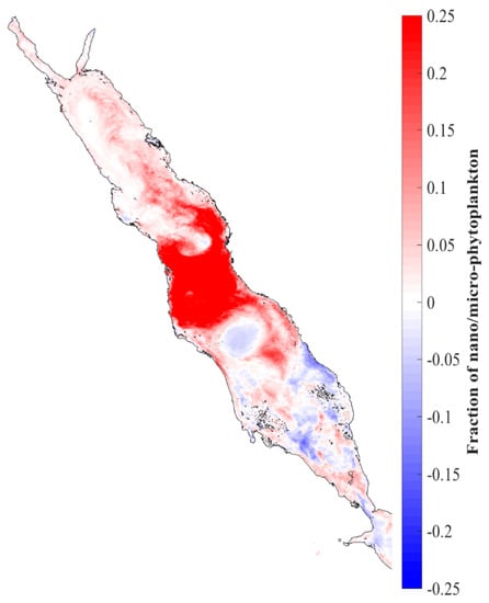 Monthly anomaly of the fractional contribution of nano/micro-phytoplankton (Fn,m) to total Chl-a concentration in October 2002. Positive (negative) values shown in red (blue) represent higher (lower) fractions of nano/micro-phytoplankton in comparison to the climatological average computed for the period 1998–2018.