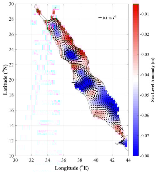 Satellite altimetry can be used to study the circulation dynamics and the propagation of cyclonic and anticyclonic oceanic eddies. We used sea level anomaly (SLA) derived from satellite altimetry, and associated geostrophic velocity data produced by Ssalto/Duacs and distributed by AVISO with support from the Centre National D’Etudes Spatiales (CNES). The geostrophic velocities are computed from gridded sea surface heights with respect to a twenty-year mean (1993–2012), based on multi-mission satellite altimeter observations. Daily data were acquired on a regular 1/4° grid between mid-September and mid-October 2002, and were then averaged into a monthly composite. The full methodological approach, and its application in the nearby Red Sea, can be found in Zhan et al. [].