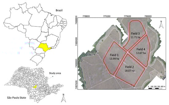 The study used a commercial site of 56.4 ha (Figure 1), composed of four fields, located in the municipality of Botucatu, São Paulo, Brazil (22°41′42.8″ S; 48°16′54.0″ W; 480 m) during the 2017/2018 and 2019/2020 sugarcane growing seasons. The climate in the study region is mesothermal, Cwa—humid subtropical, which includes drought in the winter (from June to September) and rain from November to April. The average annual rainfall in the municipality is 1433 mm. The air relative humidity is 71% with an annual average temperature of 23 °C. All fields of the study site had the same variety of sugarcane, SP83-2847 (4th ratoon), planted with a row spacing of 1.5 m in Argisol [33], and it was mechanically harvested in the late season (wet time of the year–October and November). The previous harvesting dates (10/14/2017 and 11/11/2018) were considered as a reference to determine the days after cutting (DAC) associated with the date of the orbital images and related to the phenological crop stage.