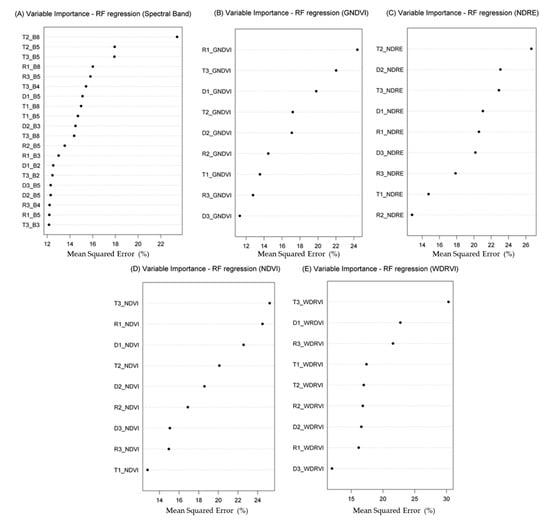 The most important variables in decreasing order according to the Mean Squared Error based on the Random Forest (RF) regression applied for the predictor variables: Spectral bands (A). Green Normalized Difference Vegetation Index—GNDVI (B). Normalized Difference Red-Edge—NDRE (C). Normalized Difference Vegetation Index—NDVI (D). Wide Dynamic Range Vegetation Index—WDRVI (E).
