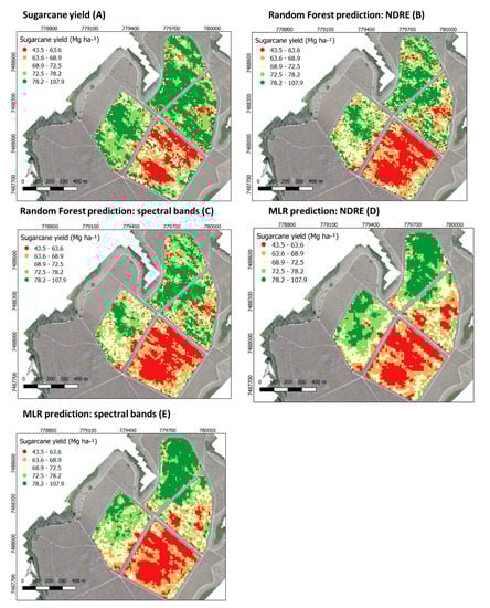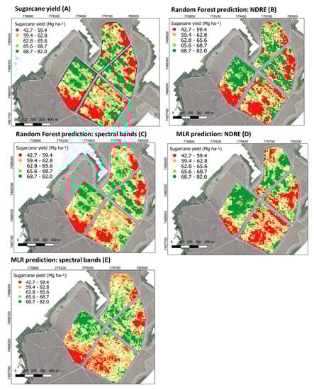 Observed sugarcane yield of 2018/2019 season (A). Predictive yield models based on Random Forest (RF) using: NDRE (Normalized Difference Red Edge) (B) and spectral bands (C). Predictive yield models based on Multiple Linear Regression (MLR) using: NDRE (Normalized Difference Red Edge) (D) and spectral bands (E).