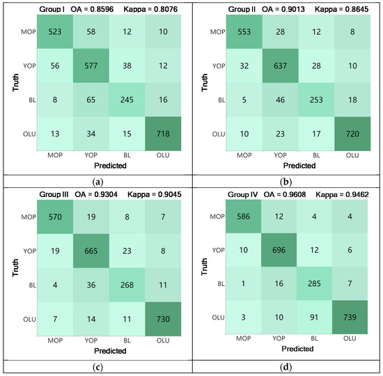 To obtain the best classification results, we set up four groups of feature combinations in this paper, as shown in Table 2 and Table 4. In these groups of feature combinations, the features of groups IV were the most relevant features derived from IGSO-RF model. These groups of feature combinations were input into the IGSO-RF classification model for oil palm detection. Combined with the 2400 validation samples, which included mature oil palm plantations (MOP), young oil palm plantations (YOP), bare land (BL), and other land uses that are not oil palm plantations (OLU), we calculated the confusion matrix for the classification results with different feature combinations and used the overall accuracy and kappa coefficient to compare and analyze the differences among the classification results, as depicted in Figure 3.