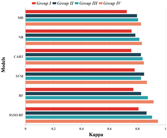 Other classification models were tested to further justify the performance of IGSO-RF. We compared the performance of IGSO-RF, random forests (RF) [31], support vector machine (SVM) [26], classification and regression tree (CART) [27], naive Bayes (NB) [28], and minimum distance (MD) [52]. The comparison was done with four groups of feature combinations (Table 4), in which the kappa coefficient was evaluated for each model. For this analysis, we chose these classification models because these are implemented in GEE platform, and we used the default parameters set by GEE, thus the model comparison may serve for GEE users in future studies.