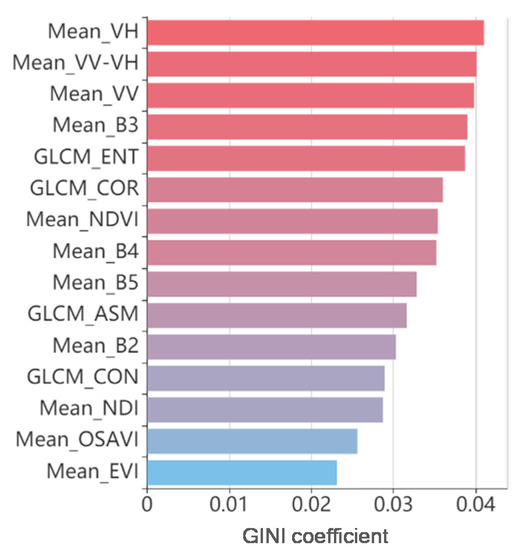The importance of feature variables and the optimization of feature groups play important roles in remote sensing image classification. Feature selection can reduce the dimensionality of data, enhance the model generalizability, reduce overfitting, and enhance the relationship between features and values [49]. To rank the most relevant features in the classification model and filter out redundant and noninformative data, the extracted features from the optical and SAR images were analyzed with the Gini coefficient importance method. The Gini coefficient importance [50], which is calculated as the total decrease in node impurity averaged over all RF decision trees, is an implicit method in the RF classifier.