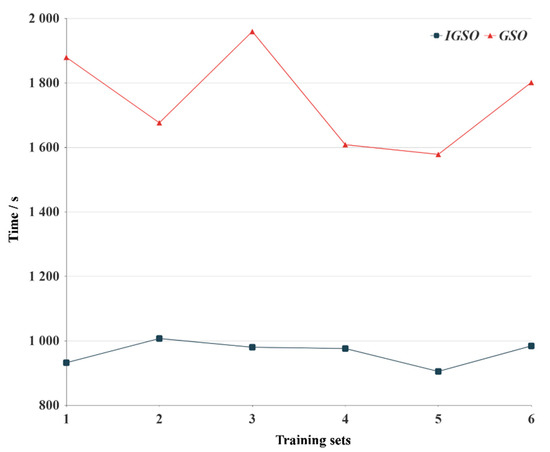 Figure 7 shows the comparison results of RF algorithm using improved grid search optimization (IGSO) and traditional grid search optimization (GSO) [33]. For this analysis, firstly, we used all our sample points and divided into six groups, which means each group has 600 samples. In addition, four spectral bands (Table 3) were selected for features of these samples. Then, for the GSO algorithm, the search steps size of and will not be changed, which were set to 10 and 1, respectively. However, we used two different step sizes for parameters searching in IGSO algorithm, and the long-distance step size of and were set to 50 and 2, respectively, while the small-distance step size were set to the same value as the step sizes in GSO algorithm. Additionally, the range of parameters in two algorithm were set to the same value. Figure 7 shows the improvement in the IGSO algorithm, its average running time was only 964s while the average running time of GSO algorithm was 1750s, indicating that the IGSO algorithm can save a lot of time for the parameter optimization due to the long-distance step searching.