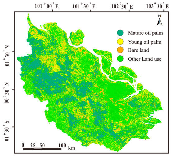 To accurately detect and map the oil palm plantations over Riau Province in 2019, the training dataset was based on 3000 data points collected from the visual interpretation of 2019 Landsat-8 images over Riau Province, and validated on high-resolution Google Earth images. We first identified the area of different land-cover types from images based on a previous study [24]. Then, for each land-cover type, we used the criteria of random sampling to obtain sample points, and the number of points were based on the area. The classes of points were visually distinguished as follows: 1. mature oil palm plantations (750 points), 2. young oil palm plantations (917 points), 3. bare land (388 points), and 4. other land uses that are not oil palm plantations (945 points).