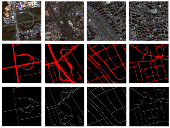 The spatial resolution of multispectral bands and the panchromatic band from the GF-2 satellite are 4 m and 1 m, respectively, as shown in Table 1. The multispectral bands for training and testing include four bands: near-infrared (NIR), red (R), green (G), and blue (B). We further discuss the band selection and suitability analysis of remote sensing images in Section 5.1. The road width ranges from 5 pixels to 50 pixels, and the width of the road centerline is 1 pixel.