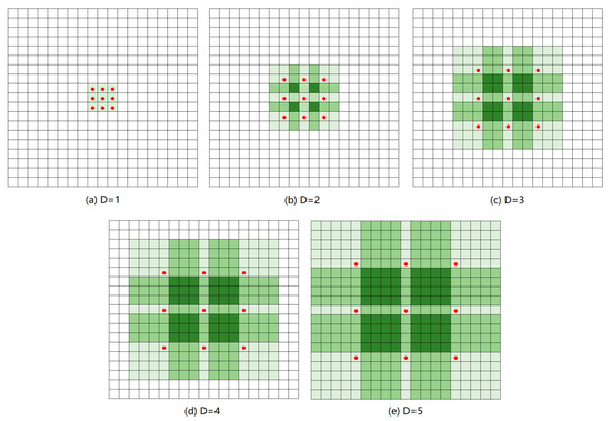 Examples of atrous convolution. The green boxes represent the size of the receptive field under different dilation rates. D represents the dilation rate.
