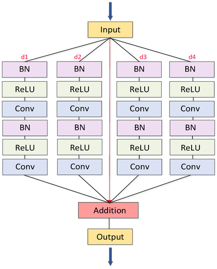 To obtain a larger receptive field and more spatial information without pooling operation, a common method is to introduce atrous convolution, a convolution that adds holes to the standard convolution layer to extract features. As shown in Figure 2, compared with the ordinary convolution layer, the atrous convolution can effectively expand the receptive field of feature extraction, retaining the feature size and reducing the loss of spatial information of features without increasing parameters. It has been proved to be an effective feature extraction approach [50]. We use multiple parallel atrous convolution branches in the Resblock module of the network to obtain the global characteristics of the road surface and road centerline in remote sensing images. As shown in Figure 3, before each convolution operation, batch normalization and Relu activation function are used. The dilation rate is set to 1, 3, 15, and 31. For example, when the dilation rate is 31, the receptive field size is 123 × 123, which fully covers the road width (5–50 pixels). The parameters were derived from Diakogiannis et al. [43].