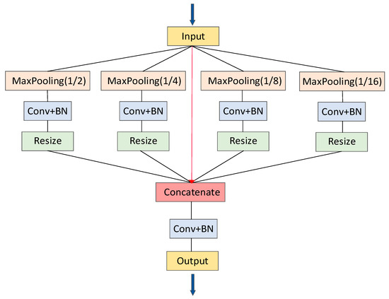 In the last stage of encoding and decoding, we apply PSP pooling to integrate multilevel features [43,51]. As shown in Figure 4, the main idea of PSP pooling is to divide the initial input into four subregions at varying levels in the feature space and obtain the pooled features of these four subregions, respectively. A 1 × 1 convolution layer is used to reduce the dimension of the context features to maintain the weight of the global features. The size of the original image is further restored by a resize operation, and finally, the pyramid pooling features are obtained by splicing and fusion in the channel dimension.