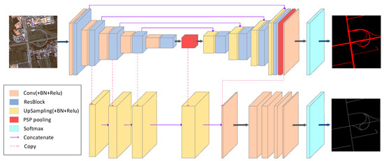 In order to better solve the tasks of road surface extraction and road centerline extraction in complex scenes from VHR remote sensing images, we propose a new two-task, end-to-end deep learning network by adopting the Resblock module and PSP pooling module in the network based on the concept of multitask learning. The MRENet architecture is shown in Figure 5. We regard the tasks of road surface extraction and road centerline extraction as two binary classification tasks. For road surface extraction, we use an encoder–decoder structure, i.e., a Resblock module, that uses multiple parallel atrous convolution branches to obtain the relationship between the road and environment backgrounds. The PSP pooling module further aggregates multiscale and multilevel features to obtain rich context information. Meanwhile, our network structure retains the skip connection structure in Unet [26] and transmits the feature map directly from the encoder to the decoder through the combination operation. This information transmission achieves the integration of the deep and shallow features, providing more fine features for segmentation.