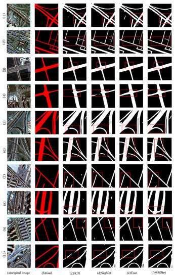 Figure 6 shows the visual comparison among the proposed model, i.e., MRENet, with FCN, Unet, and SegNet. We observe that incomplete extractions exist in all methods. However, in terms of road integrity, MRENet is able to obtain a more complete road structure. Table 2 records the quantitative results of the comparison among the selected networks. From these experimental indicators, MRENet achieves higher scores than other methods in terms of IOU and F1-score.