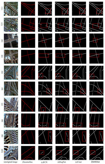 As discussed in Section 4.1, we apply a buffer width ρ as a matching area to evaluate the extraction of road centerlines, given that the road centerline dataset is developed using a semiautomatic approach. Figure 7 shows the visual comparisons of road centerline extraction results with different networks at ρ = 1. We notice that MRENet well maintains connectivity at most intersections, as the extraction results from MRENet contain considerably fewer breakpoints compared to other methods.