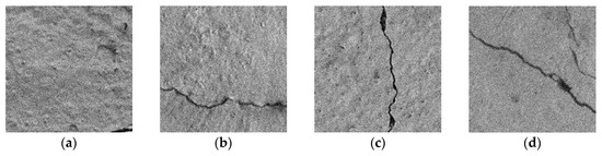 Examples of different types of images in the dataset: (a) Without crack; (b) longitudinal crack; (c) transverse crack; (d) oblique crack.
