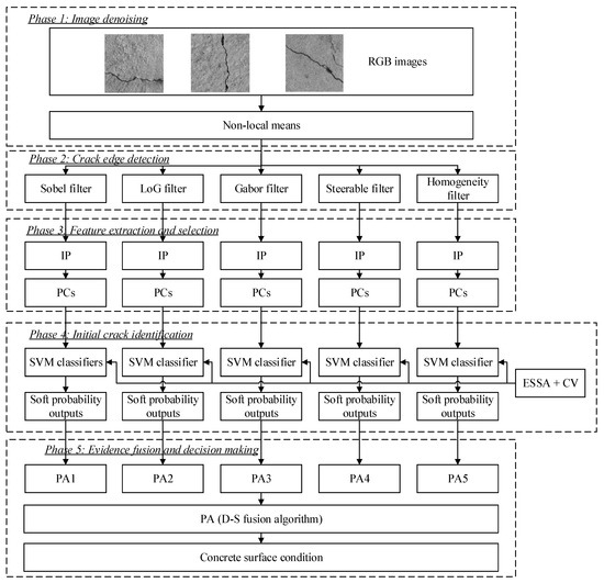 The schematic of the proposed hierarchical framework is displayed in Figure 2. As shown in the figure, the framework is divided into four analysis phases, i.e., image pre-processing, crack edge detection, feature extraction and selection, and crack pattern identification. In the phase of pre-processing, the non-local means algorithm is employed to deal with the raw images to eliminate the noise interference. In the second phase, the denoised images are processed by five adaptive filters, including Sobel, Laplacian of Gaussian (LoG), Gabor, steerable and homogeneity filters, for crack edge detection. In the third phase, crack-sensitive features are extracted and normalized using the integral projection method. To prevent feature information redundancy and decrease the feature dimension, principal component analysis is introduced to select optimal components to stand for whole feature information. Based on selected principal components, the SVM classifiers with posterior probability outputs are built up in the fourth phase, which provide the initial identification results. To ameliorate the generalization capacities of SVM classifiers, the enhanced salp swarm optimization (ESSO) algorithm and cross-validation (CV) operation are employed to optimize the SVM meta-parameters during the model training. In the fifth phase, the posterior probability outputs of SVM, regarded as the evidences, are transformed into the basic probability assignments (PAs), and the D–S evidence fusion algorithm is used to fuse the initial results obtained from different filters to give a final result. Since the initial identification results from different filters may be either inaccurate or conflicting, the fusion of these results is capable to effectively avoid the wrong identification. It is noticeable that the proposed framework adopts a hierarchical architecture, where the outputs in the former phase are the inputs in the next phase. Hence, via multi-phase image processing, the identification accuracy and robustness of concrete crack can be guaranteed.