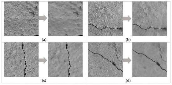 Image processing results using non-local means method: (a) Without crack; (b) longitudinal crack; (c) transverse crack; (d) oblique crack.