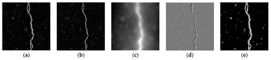 The crack edges in the image can be determined according to this gradient value. Given the threshold Ts, if , the pixel is regarded as the edge point; otherwise, it is a non-edge point. In this study, the value of is set at 3.73, as suggested in [18].