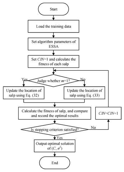 Flowchart of ESSA to optimize parameters C and σ2 of SVM.