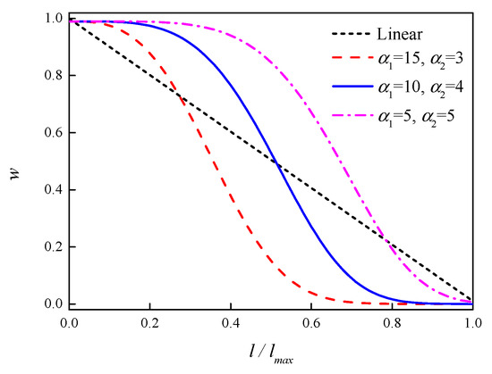 In this study, 80% of images of each class are randomly selected as the training samples to develop the SVM sub-classifier while the rest of images are used as the validation samples to evaluate the effectiveness of the proposed model. The setting of basic parameters of ESSA is given as follows: swarm size is 50 and the maximum iteration number is 200. Additionally, how to define the decreasing weight w is also important, since it directly affects the accuracy and convergence of algorithm [48]. Generally, in the initial stage of algorithm evolution, we need a large weighting to enhance the global search ability of ESSA, while in the later stage, a small weighting is required to improve the local search ability. In [49], a linearly decreasing weighting factor was proposed to update the location of leader salp. However, when it is far from the food source, the SSA with linear decreasing weight may fall into the local optimum. Accordingly, this study corrects this problem and proposes an S-curve-based decreasing weighting factor, with the expression in Equation (34):