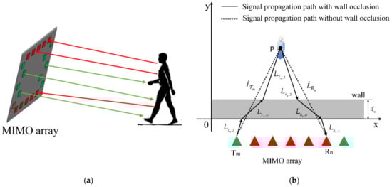 (a) Sketch map of multiple-input multiple-output (MIMO) radar human detection; (b) Geometric schematic diagram of MIMO radar through-wall imaging.