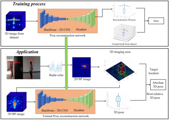 On the basis of the development of UWB MIMO radar 3D imaging and deep learning technology, we designed a framework for through-wall human target pose reconstruction. The whole flowchart of our proposed pose reconstruction framework is shown in Figure 3. The proposed framework covers two stages, i.e., training process and application. In the training process stage, the 3D radar image from the dataset is translated into a 3D pose by the designed 3D CNN model. The training loss is obtained by calculating the error between the reconstructed pose and the ground truth, and then the network parameters are optimized by backward propagation.