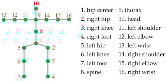 The dataset preparation flowchart is presented in Figure 5, where the process of generating 3D radar images is the same as that in Figure 3. The optical camera captures the image of human target, and then inputs the image into the trained optical image pose reconstruction network to reconstruct the 3D pose of the human target, where the 3D pose contains 16 joint points, namely head, thorax, spine, shoulder (left and right), elbow (left and right), wrist (left and right) and, hip (left, right, and center), knee (left and right) and foot (left and right), the details are shown in Figure 6. Finally, the 3D radar image and 3D pose are stored in the dataset as samples and labels, respectively.