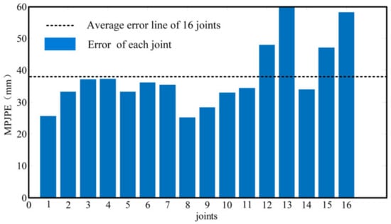 The different joints reconstruction error in the 23th epoch is shown in Figure 9, it reports the MPJPE of 16 different joints, where the joint names correspond to the numbers referred to in Figure 6. Figure 9 shows that the main body parts, such as the hip center and spine, achieve less reconstruction error than the average error, while the elbows and wrists achieve higher reconstruction error. The main reason for this phenomenon is that the small size of the elbow and wrist leads to weak reflected signal strength. When the distance of the target is relatively far, the size of the elbow and wrists may be smaller than the resolution of the UWB radar system, which makes it impossible to capture these body parts. Furthermore, the elbow and wrist have a higher degree of freedom and a range of motion than the hip-center and spine, resulting in higher joint reconstruction error. Overall, it can be seen from Figure 8 and Figure 9 that our framework achieves excellent pose reconstruction accuracy.