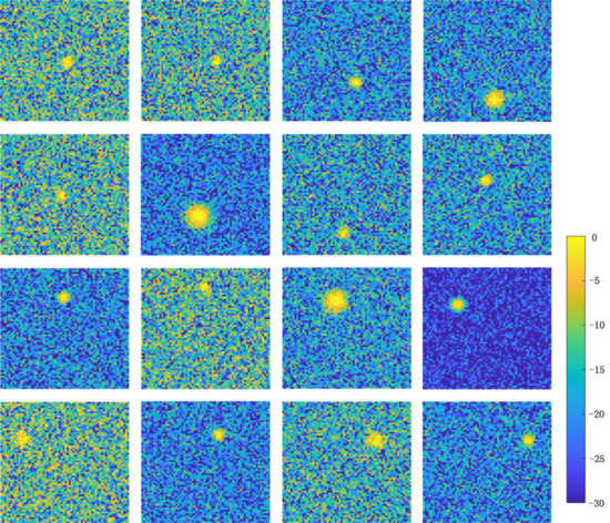 We also give the visualization results of the features extracted by the last layer of our 3D CNN network, as shown in Figure 12, which are the projection of the confidence probability maps of 16 joints. It represents the probability of the position of the joint point in the azimuth-height plane, where the point with the largest value is considered to be the joint coordinate, which can be obtained by using the soft-argmax function. By comparing the positions of the 16 joints with the reference optical image in Figure 10a, it is found that the positions of the joints are reconstructed by our network. Therefore, the feature visualization results verify the effectiveness of our trained network.