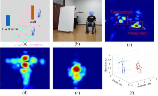 As for the single target experiment, Figure 14c shows the detection scene for visual reference, where the human target holds the boxing pose behind the brick wall with a thickness of 24 cm. The UWB radar system is placed in room B, as shown in Figure 14b. Figure 14d is the 2D imaging result of the detection area, which takes CFAR detection to lock the target position in the 2D image, which contains the distance and azimuth information of the target. Then, the 3D imaging is performed on the area where the target is located. To see the 3D images more intuitively, we made a maximum projection towards the azimuth-height direction in the 3D images, the projection image is shown in Figure 14e, which represents the azimuth-height information of the human body structure. Figure 14f is the final absolute pose calculated by our framework, it shows that our framework produces convincing results even for the target behind the brick wall, which proves that our system has strong penetrability.