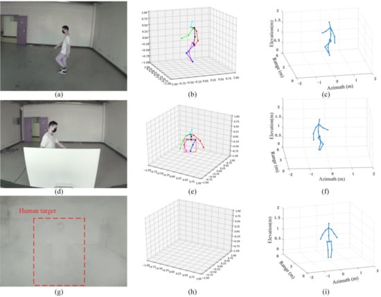 Human pose reconstruction has developed rapidly [,], and has made breakthroughs in computer vision. However, most of the research has been based on visual sensors that are unable to cope with shaded and dark environments, especially complex urban environments. Visual sensors also face the privacy leakage problem, which limits their applications. A radar system with electromagnetic waves as the information carrier is an active detection sensor, which is different from vision system technology and can complement visual information. In terms of the technical principle, it solves the detection problems caused by the complex environment such as no light, shielding, and non-line-of-sight []. Existing studies on radar sensors mainly use the micro-Doppler effect of radar to classify the movement of human targets [,]. However, these studies can only judge the motion state of human targets, and cannot obtain the spatial location information of different body parts of human targets. There are few studies on human pose reconstruction based on radar sensors, which is a new and urgent research. Zhao Mingming and others proposed a pose reconstruction method based on radio frequency signals called βRF-Poseβ [,]. This method used a βTβ shaped radar system with a bandwidth of 1.8 GHz (5.4β7.2 GHz) and used a teacher-student network to reconstruct the pose of human targets. Arindam Sengupta et al. designed a real-time human skeletal posture estimation method based on millimeter-wave radar and CNN called βmm-Poseβ []. This method converted 77 GHz radar data into point cloud data, and then used CNN to reconstruct the pose of the human target from the projection image of the point cloud data. Those methods further expanded the application range and greatly improved the practicality of radar technology. However, although the sensors used in these methods have higher resolution to ensure detection accuracy, they have limited penetrability and can only be used in unobstructed scenes or scenes obstructed by better penetrating material.