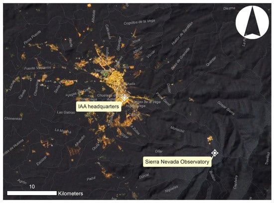 In addition, the Sierra Nevada Observatory (OSN), located more than 2000 m above and more than 20 km away from the city of Granada (lat = N 37.0642, long = W 3.38472, h = 2900 mamsl), is equipped with an All-Sky Transmission MONitor (ASTMON), an imaging device that measures sky brightness in the UBVRI Johnson bands at all-sky locations [28], not just at the zenith. The instrument is fully robotic, i.e., it performs all astronomical data reduction and calibration tasks automatically, obtaining maps of sky brightness through the night. For this study, we selected the values of sky brightness at an azimuth and altitude where the glow of Granada’s city is clearly observed (∼20 above the horizon) as shown in Figure 1. This point was carefully chosen to avoid saturated values caused by its proximity to the city. Locations are shown in the Figure 2.