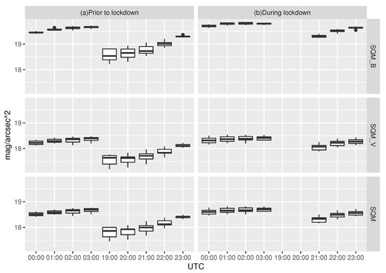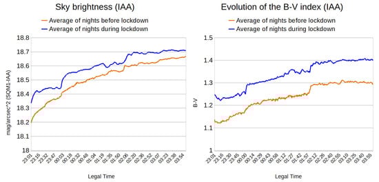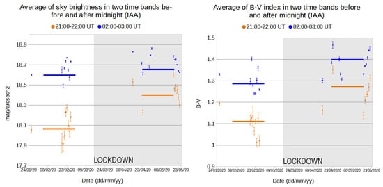 We have defined two groups of data based on the pandemic’s policies in Spain: from the days of 26 January and 19–26 February; and from the days of 15, 22, 23, 28, 29, 30 April and 17–22 May. The first group corresponds to pre-lockdown sky brightness and the second to sky brightness obtained at the time of lockdown. The first thing to note is that both in the brightness measurement and in the B-V index there is a clear difference between the first hours of the night and the last hours, especially before lockdown: from 21:00 to 22:00 UT the night sky of Granada is on average 0.54 mag/arcsec2 brighter than from 2:00 to 3:00 UT. Similarly, the average value of B-V is higher from 2:00 to 3:00 UT (B-V is 1.28 after midnight and 1.11 before midnight, so a 0.17 difference).