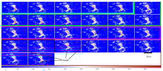 Figure 4 shows a comparison of satellite imagery of Granada on clear and moonless nights prior to lockdown and during lockdown. Quantitative analysis indicates that the average intensity of emissions decreased by around during the lockdown. Comparison of 2018 and 2019 data indicate similar emissions values, although Granada has an ongoing municipal program of transition from High Pressure Sodium (HPS) to LED lighting, so this can only be considered as a lower threshold of change. The dispersion of the day to day intensity observations is of 14%, although it is worth mentioning that the lowest values of the series occurred during the lockdown. The brightest individual light source in Granada (indicated as “Nevada” in the figure), which was lit up constantly during the lockdown is not visible on many of the images because of the angle of observation. This illustrates the important role of the angle of observations in these measurements. Some other research has not consider this potential issue [30,31,32].