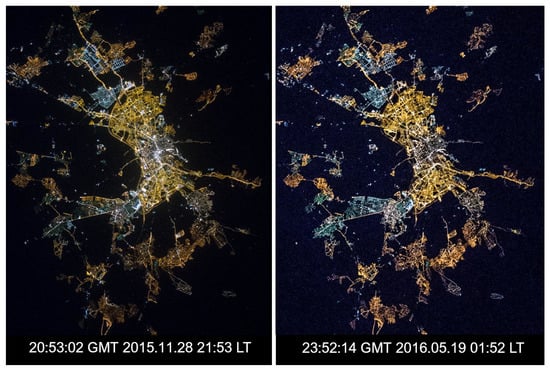 Note that private lighting can be a significant contributor to light pollution [46], and is usually bluer than municipal lighting, at least in some cities where cold led lighting is not extended yet. In the case of public lighting in Granada the predominant lamp is still high pressure sodium vapour, while ornamental and commercial lighting is mainly white-blue. This statement is based on the direct visual inspection made by the authors (see Section 2.4). Especially illustrative is also Figure 6, in which two images taken from the ISS at different dates and times are compared. The variation in colour and brightness of the city centre is remarkable.