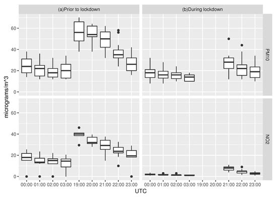 Hourly measurements of particulate PM10 and nitrogen dioxide concentrations (in μg/m3) depending on lockdown state (IAA-CSIC, Granada).