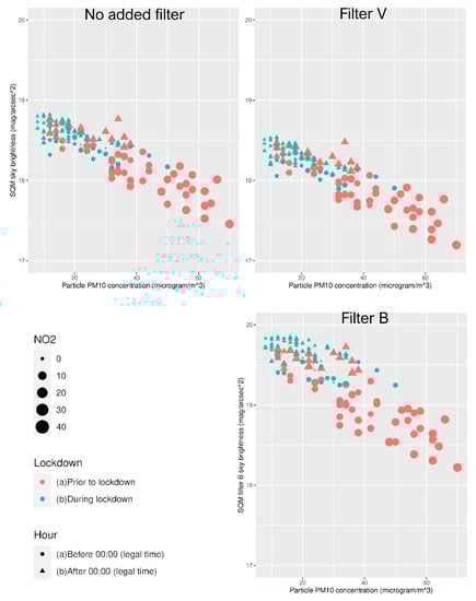 Figure 9 presents the measurements of PM10 particle concentration versus the sky brightness value (SQM without added filter, with filter V and with filter B). The upper left hand area of each graph (darker sky and lower particle concentration) is mostly occupied by measurements taken after 00:00 (legal time) during lockdown, to which the lower NO2 concentration values correspond. In contrast, the lower right zone (higher particle concentration and brighter sky) corresponds to hours before midnight on days prior to the declaration of the alarm state, and which are associated with higher NO2 concentration values. In the hours before midnight and prior to lockdown there was more traffic and activity, but it is also necessary to take into account that the concentration of nitrogen dioxide can be increased by higher levels of artificial light [37]. It should come as no surprise that the correlation between sky brightness and particle concentration is linear. The astronomical magnitude is logarithmic and the single scattering flux is proportional to , where is optical thickness, and is proportional to the particle concentration [38,39,40].