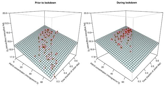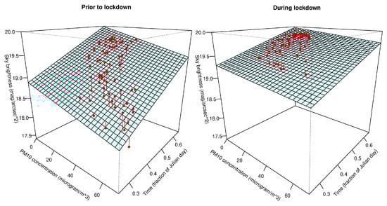 The correlation between sky brightness and particulate air pollution is also evident by performing a multivariate analysis, including time as a third dimension. Variations in urban lighting depend mainly on the time of night, and therefore can be expected to influence the sky brightness values. On the other hand, pollution levels depend on human activity, which varies throughout the night. Thus, we have calculated a model that estimates a value of sky brightness as a function of time (as a fraction of a Julian day) and particle concentration. Table A6, Table A7, Table A8 and Table A9 (Appendix C) show the values of the multivariate models for sky brightness with SQM without filter and SQM with B filter, before and during lockdown. Figure 10 and Figure 11 show the models fitting for the SQM photometer without added filter and the SQM with filter B.