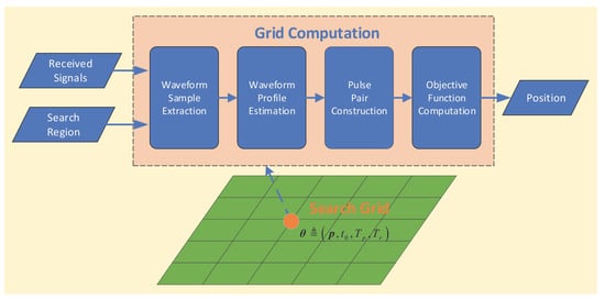 The brief flowchart of the estimation for the transmitter position is shown in Figure 2. Since this localization algorithm is direct for the position estimate, we call it direct position determination based on waveform estimation (DPD-WE).