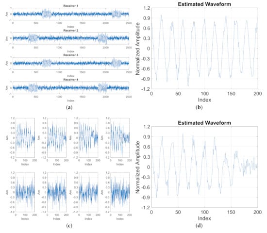 The estimation results of the transmitted Gaussian waveform at the completely correct hypothetical and a wrong hypothetical for all pulse pair signals with and . (a) All received signal measurements with two pulses at SNR 5 dB. (b) Estimate of the waveform at the correct hypothetical . (c) All intercepted pulses corresponding to a wrong hypothetical . (d) Estimate of the waveform at the wrong hypothetical .