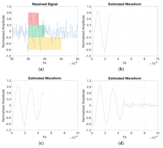 An example of waveform estimation is given in Figure 4, where the estimation is implemented according to 8 extracted pulse samples. As proposed above, extracted samples have two different cases: one is that all samples follow an identical signal model (consistent samples) and the other is that they come from different signal models (inconsistent samples). The former estimation provides the foundation for accurately estimating the waveform, shown in Figure 4b, while the latter, corresponding to an incorrect search parameter , results in terrible extraction and estimation, shown in Figure 4c,d respectively. Therefore, a correct search parameter can guarantee samples consistent in model, and exactly based on that, we can construct the true pulse by the accurate estimated waveform . Next, we will discuss how to utilize the objective function to estimate the position of the transmitter.