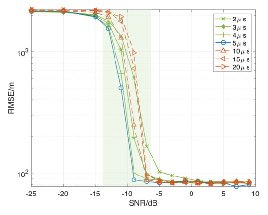 To verify the tolerance of DPD-WE to the pulse width we are searching for, we test the localization performance of the algorithm for the transmitter at many SNR environments in a wide range of searched widths. The algorithm is executed based on grid computation by searching for , and of interest at different given searched pulse widths. Figure 6 shows the RMSE of the estimated positions in 1000 independent localization experiments, in each of which the transmitter appears randomly within the rectangle region of . According to the Figure 6, it is fundamentally concluded that the algorithm can achieve considerably high accuracy at sufficient SNR, no matter what pulse widths are chosen. However, there are still some performance differences between them at low SNRs, marked by the green rectangle in the plot. Generally speaking, wider searched pulse width can obtain smaller RMSE when the width is smaller than the true one. On the contrary, larger searched width results in a large RMSE when the width is wider than the true one. This phenomenon can be explained from the perspective of signal processing gain. Intercepting the consistent waveform samples within the true pulse generally ensures that these samples do not contain any part of pure noise, which means that a widely intercepted width can collect more waveform energy than a narrow intercepted width. Therefore, the localization performance with such searched widths improves with the width increasing, and will reach the top when complete waveform samples not containing any pure noise is intercepted sufficiently, exactly corresponding to the case that searched width equals to the true. On the other hand, a searched width larger than the true width definitely causes intercepting extra pure noise without exception. The redundant noise will reduce SNR of the estimated signal, and further impair the localization performance. Fortunately, different searched pulse widths only have a limited impact on the performance, which happens mainly in lower SNR. Consequently, in practical applications, we can implement localization only by using an appropriate searched width, which is easily selected by few tests.