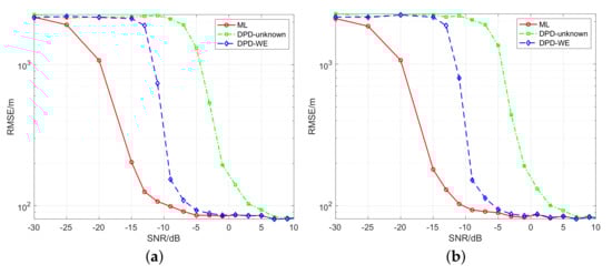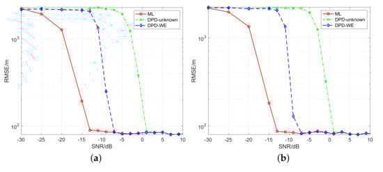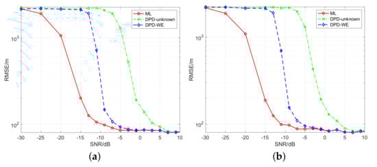 The Figure 7 shows the RMSEs of the ML-based localization, DPD-unknown and DPD-WE methods against SNR for the Gaussian pulse pair signal, where Figure 7a,b correspond to the noncoherent and coherent cases respectively. It is seen from the two plots that RMSEs of these localization methods decrease with SNR rising, and will keep unchanged at considerably low level after SNR becomes sufficiently large. It is worth noting that the low bound of RMSE is limited by the size of grid since the grid computation is employed, and it can be adjusted according to the demand for practical localization accuracy. Figure 7a,b show that the proposed DPD-WE algorithm can achieve almost completely similar accuracy for noncoherent and coherent cases and successfully localize the transmitter at sufficient SNR. It exactly tallies with the proposed signal processing approach, where the received pulses are processed noncoherently due to unknown knowledge about these pulses, including modulated phases.