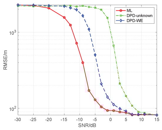 Additionally, for the Gaussian transmitted signal, Figure 8 also shows the localization performance of three methods in the case of only receiving a single pulse, where the observing time is set as . The simulation result demonstrates that DPD-WE has the same performance advantage over DPD-unknown, which means that DPD-WE can be applied to the scenario of single pulse.