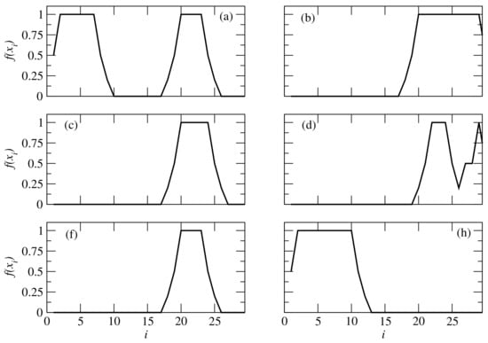 Indicator function with and for the 8 cloudy scenes (cases (a–h)); i and j refer to the pixel index in the xy plane, while each pixel corresponds to a 500 m × 500 m area.