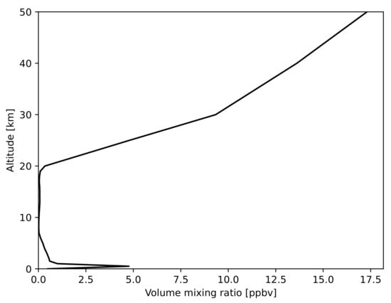 - For a clean scenario, we use the a priori partial column profile of [] illustrated in Figure 3 to generate the true (exact) partial column profile. In this regard, denoting the a priori partial columns of gas g by , we choose the true partial columns as , with and . The true total column of gas g is then computed as ; thus, .