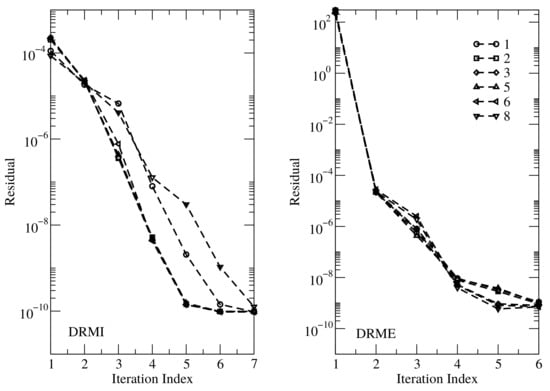 - In DRMI, the residual decreases very fast at the first iteration step and then more steadily, while in DRME, the residual gradually decreases.
