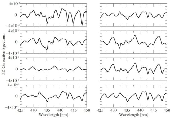 In Equations (8)–(11), is the vector comprising the total columns of trace gases; an a priori estimate of ; the (noisy) spectral signal measured by the instrument at wavelength , where , the number of measurement wavelengths; the simulated spectral signal computed by a multi-dimensional radiative transfer model; with , the correction spectra including, for example, the polarization correction spectrum and the Ring spectrum, the number of correction spectra; and with , the (wavelength independent) amplitudes of the correction spectra. The polynomials , , and with degree account for the low-order spectral structure due to the scattering by clouds and aerosols, while the differential spectral signals and are mostly due to the gaseous absorption processes (see Ref. [] for details). Specifically, in DRMI, the coefficients
