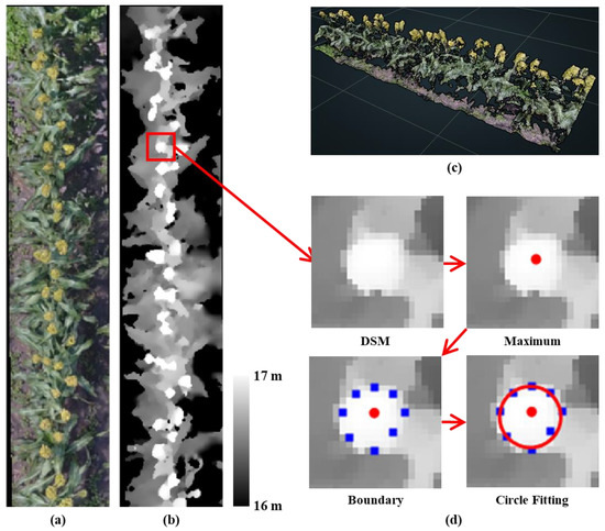 Subset of (a) the orthomosiac image and (b) the digital surface model (DSM); (c) perspective view of RGB-colored 3D point cloud for a single row; (d) example of individual panicle detection in DSM, where red and blue dots indicate local maximum and boundary points, respectively; the most suitable circle (red circle) was fitted using boundary points for an individual panicle.